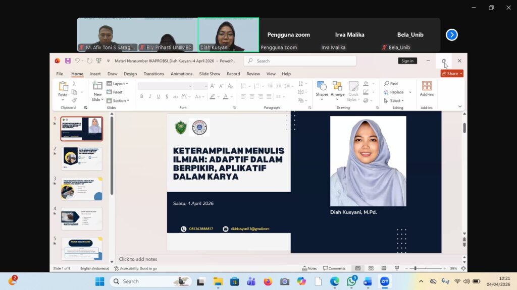Medan, 4 April 2026 — Kegiatan Srawung Akademik IKAPROBSI 2026 sukses diselenggarakan pada Sabtu, 4 April 2026, pukul 09.00–11.00 WIB secara daring melalui Zoom. Mengusung tema “Keterampilan Menulis Adaptif dan Aplikatif”, kegiatan ini menjadi wadah akademik bagi mahasiswa dan dosen dalam mengembangkan kompetensi menulis yang relevan dengan kebutuhan zaman.